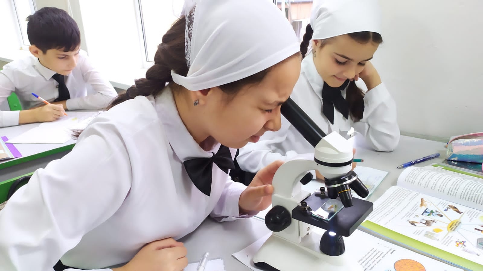 На базе образовательного центра «Точка роста» учителем биологии Акуевой И.А. Была проведена лабораторная работа с учащимися 5 «Б» класса по теме «Изучение клеток кожицы чешуи лука под микроскопом».В ходе данной лабораторной работы обучающиеся познакомились с устройством микроскопа, увидели, как выглядит увеличенная клетка кожицы лука, и зарисовали ее в тетради.