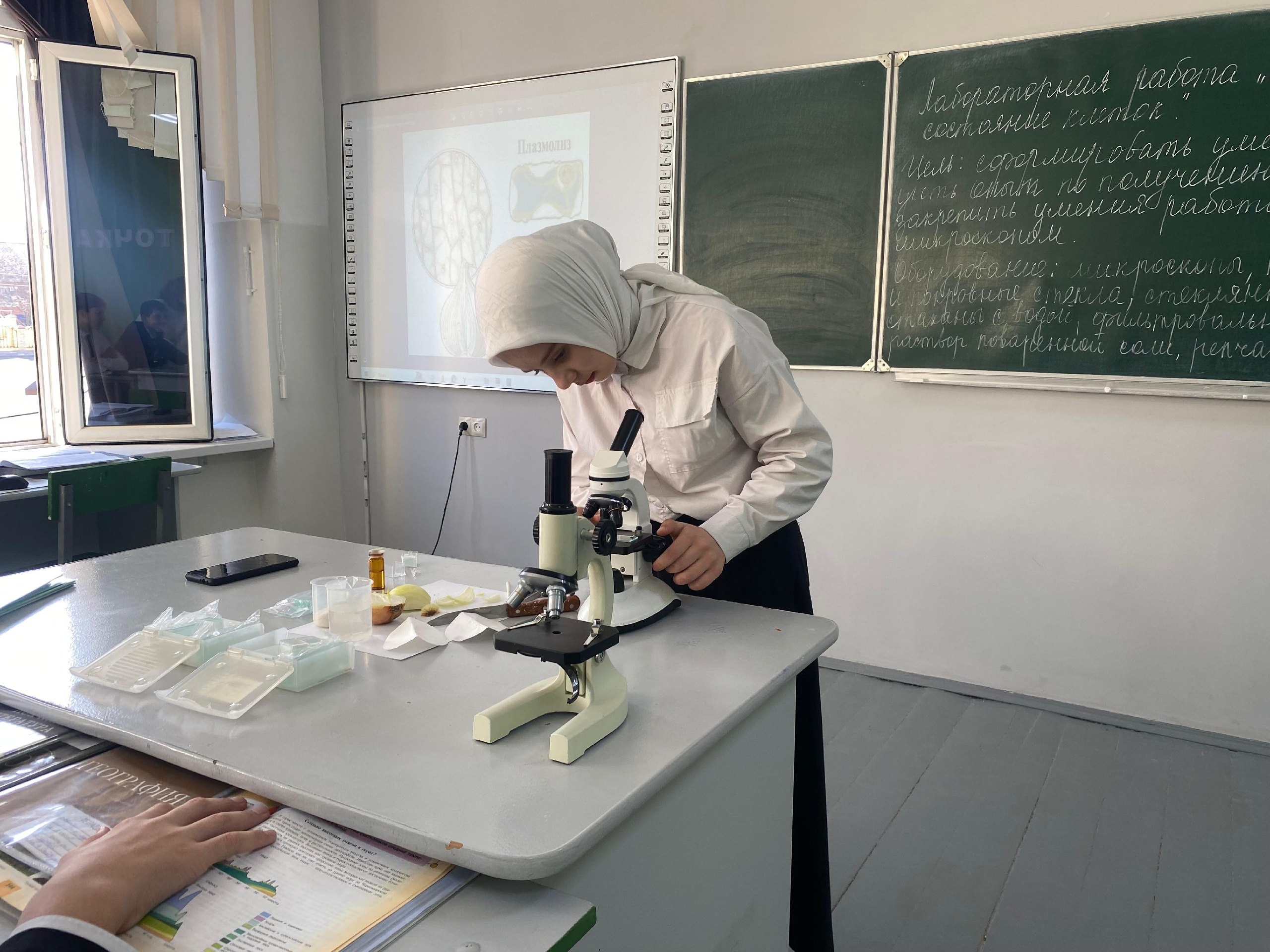 В МБОУ «СОШ 1 с. Алхазурово им.А.Сулейманова» на базе центра Точка Роста в рамках федерального проекта «Современная школа» национального проекта «Образование», 21 февраля 2025 г., прошла лабораторная работа по теме "Тургорное состояние клеток". Целью данной работы была, сформировать умение проводить опыт по получению плазмолиза, закрепить умения работать с микроскопом, проводить наблюдение и объяснять полученные результаты. При выполнении лабораторной работы не обошлись без микроскопа, только через этот оптический прибор можно увидеть мир клеток. А также обучающиеся использовали предметные и покровные стекла, стаканы с водой, фильтровальную бумагу, раствор поваренной соли, репчатый лук.