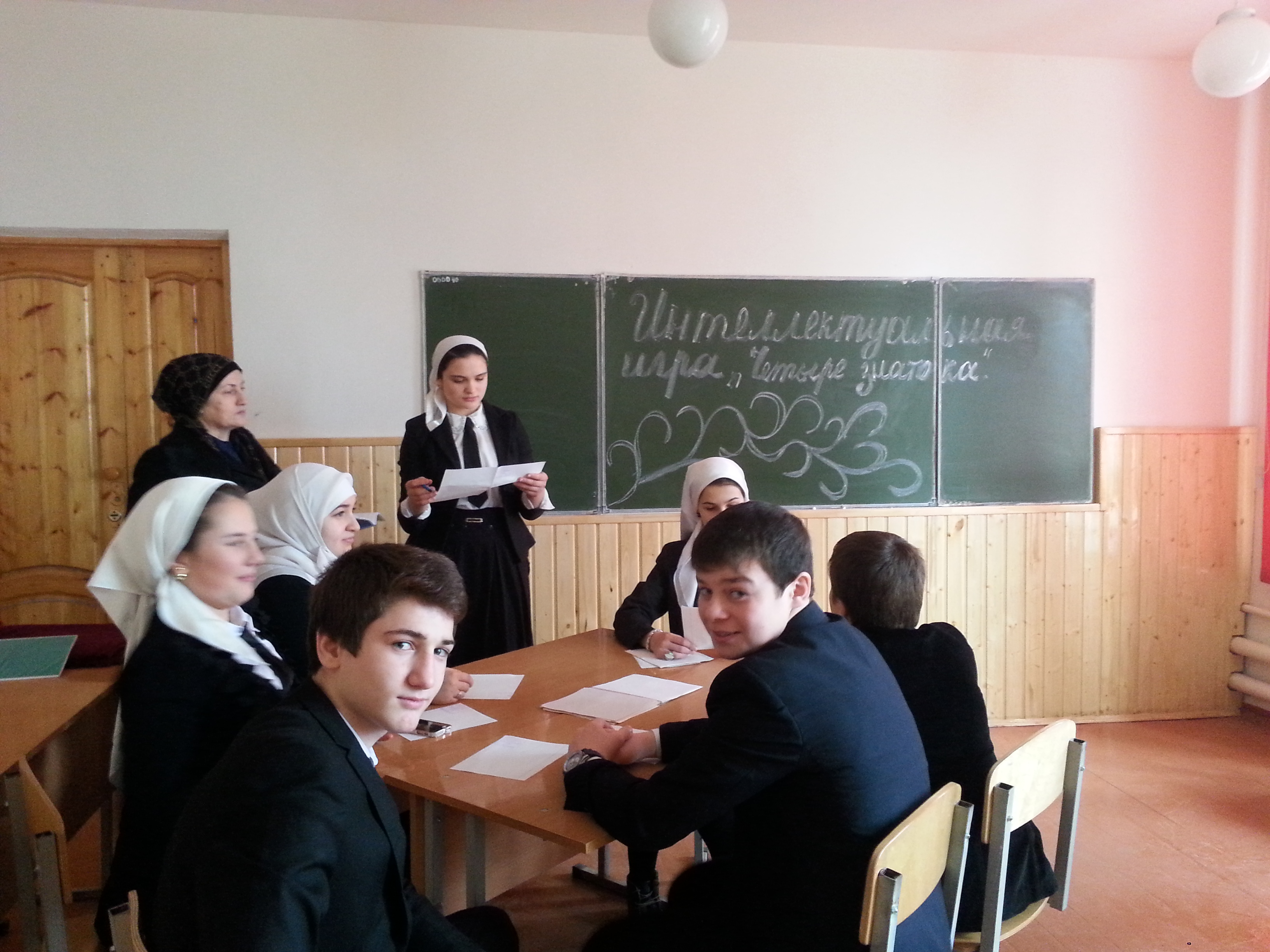 16.01.2015В МБОУ «СОШ №1 с Алхазурово им . А. Сулейманова» 16 .01 2015 гпроведен школьный отборочный тур на участие в IVЕжегодной республиканской интеллектуальной игры«Четыре знатока» Командой преподавателей были составлены по учебным дисциплинам вопросы , на которые можно давать четкие однозначные ответы .Замдиректора по УВР Хазаева П С ознакомила учащихся с правилами поведения игры. Соревновались учащихся учащиеся 9-11 классов. Из 4-ех команд были отобраны наиболее активные участники . На муниципальный этап конкурса «Четыре знатока» направлена команда в составе учащихся 11 классов Мусаевой Э, Дадаевой З, Сугаиповой Х, Хасиевой Х.Зам. директора по ВР Х.С. Хазаева