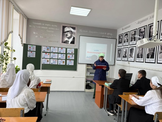 11.12.2024В соответствии с планом работы в МБОУ "СОШ №1 с.Алхазурово им. А. Сулейманова"проведены мероприятия, приуроченные ко Дню Конституции Российской Федерации. В библиотеке школы с 29 ноября была оформлена выставка брошюр, информационного материала о Конституции Российской Федерации. ( отв. Туриева Л. Х.).С обучающимися 1-11 классов проведены классные часы по темам: "Конституция Роосии- основной закон государства","Наша Родина- Россия"," Герб, флаг, гимн России","Основные права человека и гражданина" ( правовой час). На всех мероприятиях воспитывались патриотические чувства обучающихся, проводилось знакомство с историей Государственного герба, флага и гимна России.