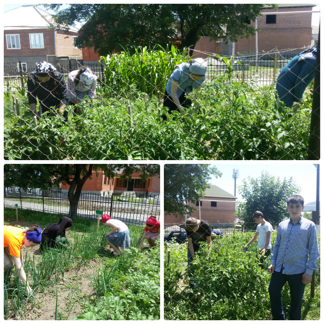Учащиеся 7-ых, 8 и 10 классов, ухаживают за пришкольным участком. В период с 26 июня по 3 июля учащиеся собрали с луковой грядки с сорную траву, п ровели полив рассады помидоров и подвязали помидоры .Мальчики вынесли мусор с участка.